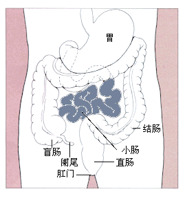 小腸可分為3個部分:十二指腸、空腸和迴腸。十二指腸是一條C字形的管子,約長30公分。它接受來自胃的食糜、胰臟的消化液和膽囊的膽汁,並且還釋放出自已的消化脢。空腸約長180公分,它緊密的彎曲著,並產生完成消化過程的脢。迴腸約長4公尺。迴腸在消化中只起小部分作用,主要的功能是從已消化過的食物中吸收營養素。